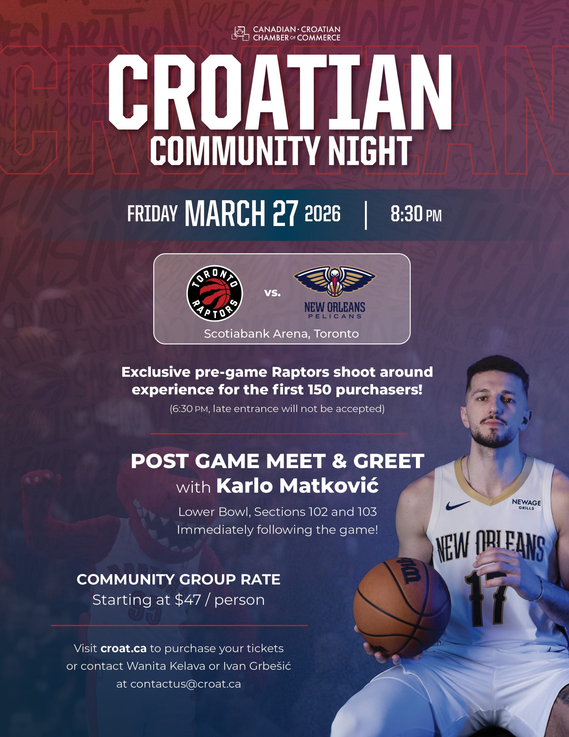 In celebration of Croatian Community Night, we have secured spots for the first 150 purchasers to view the Raptors pre-game shoot around before gates open!