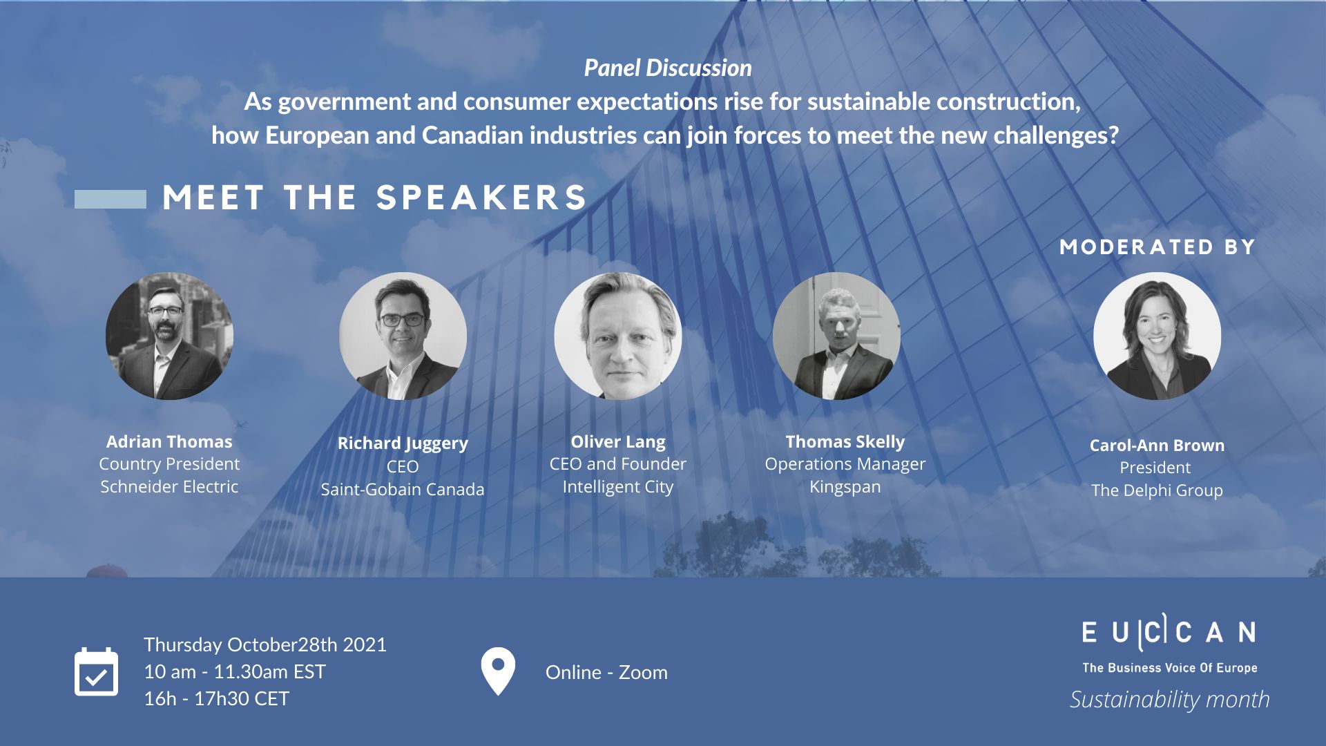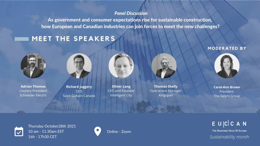 During this panel discussion, speakers will give persepctive on the construction landscape in EU, and how it is similar to or different from Canada. They will also give examples of driving sustainable actions in the construction industry and the impact made. Finally, they will discuss how EU and Canadian companies can accelerate innovation and push sustainability in the construction sector to support Canada’s net zero emissions agenda.
