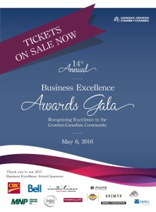 The Canadian-Croatian Chamber of Commerce will host the 14th Annual Business Excellence Awards Gala on Friday, May 6, 2016 at the Burlington Convention Centre, 1120 Burloak Drive, Burlington, Ontario, opening with cocktails at 6:00 p.m.
